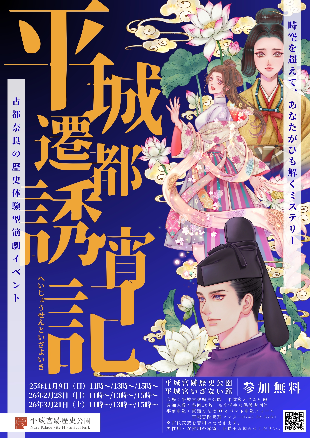 イベント情報 平城宮跡歴史公園は、奈良時代を今に感じる特別な空間です。 年間を通じて、平城京の歴史や体験学習、奈良らしい地域のイベントを毎月実施しています。 申込み制となっているものもありますので、イベント案内をよくご覧ください。 月別イベント一覧 2026年3月のイベント 2026年2月のイベント 2026年1月のイベント 2025年12月のイベント 2025年11月のイベント 2025年10月のイベント 2025年9月のイベント 2025年8月のイベント 2025年7月のイベント 2025年6月のイベント 2025年5月のイベント 2025年4月のイベント 2025年3月のイベント 2025年2月のイベント 2025年1月のイベント バックナンバー 2024年のイベント 2023年のイベント 2022年のイベント 2021年のイベント 2020年のイベント 2019年のイベント 2018年のイベント イベントで絞り込む スポーツトークイベント・講演会アート・クラフト歴史南門復原関連自然地域文化その他展示季節イベント 2026/03/21(土)【古都奈良の歴史体験型演劇イベント】平城遷都誘宵記(へいじょうせんといざよいき)11/9・2/28・3/21 衣装に着替えて参加する歴史演劇イベント 711年、完成間近の平城京に「白い影」が現れた 「… ...まつれ… …なぜ忘れた… ...」 このミステリーを解決するのは、奈良時代に タイムスリップした「あなた」 物語に登場するのは、「元明天皇」「藤原不比等」「太安万侶」 そして、あなたは幽霊を探し出し、都を救うという使命に挑む。 なぜ幽霊は現れるのか、その謎を解いてください! その他関連イベント 2026/03/16(月)第12回デジタル写真講座 写真を作品として仕上げる技術を身につけたい方の講座です。初心者でもわかりやすく、ソフトの導入のしかたからRAW現像の基礎まで丁寧に指導します。フォトコン テストで入賞・入選を果たしたい、プロの編集方法を知りたい・・といった方にお勧めです。 アート・クラフト関連イベント 2026/03/07(土)第12回写真撮影講座 初心者だけど、撮影技術を向上させたい方のための講座です。カメラの設定や構図の決め方などプロが教えないプロの技術も学べます。SNSに素敵な写真を投稿したい、 フォトコンテストにチャレンジしたい・・といった方にお勧めです。 アート・クラフト関連イベント