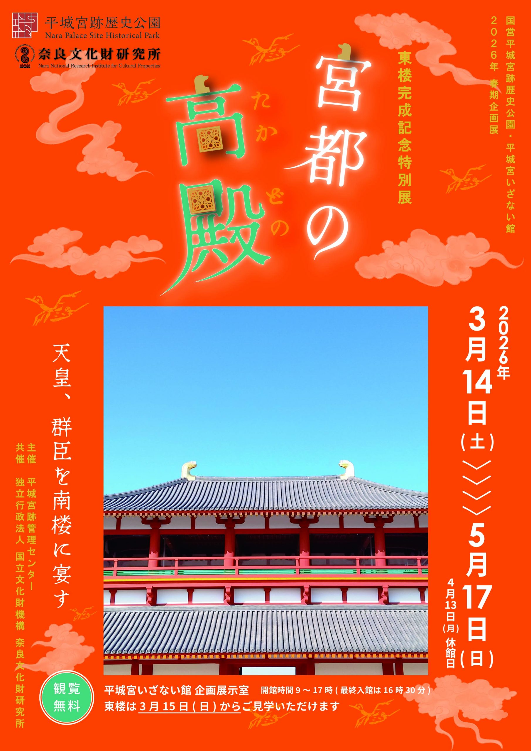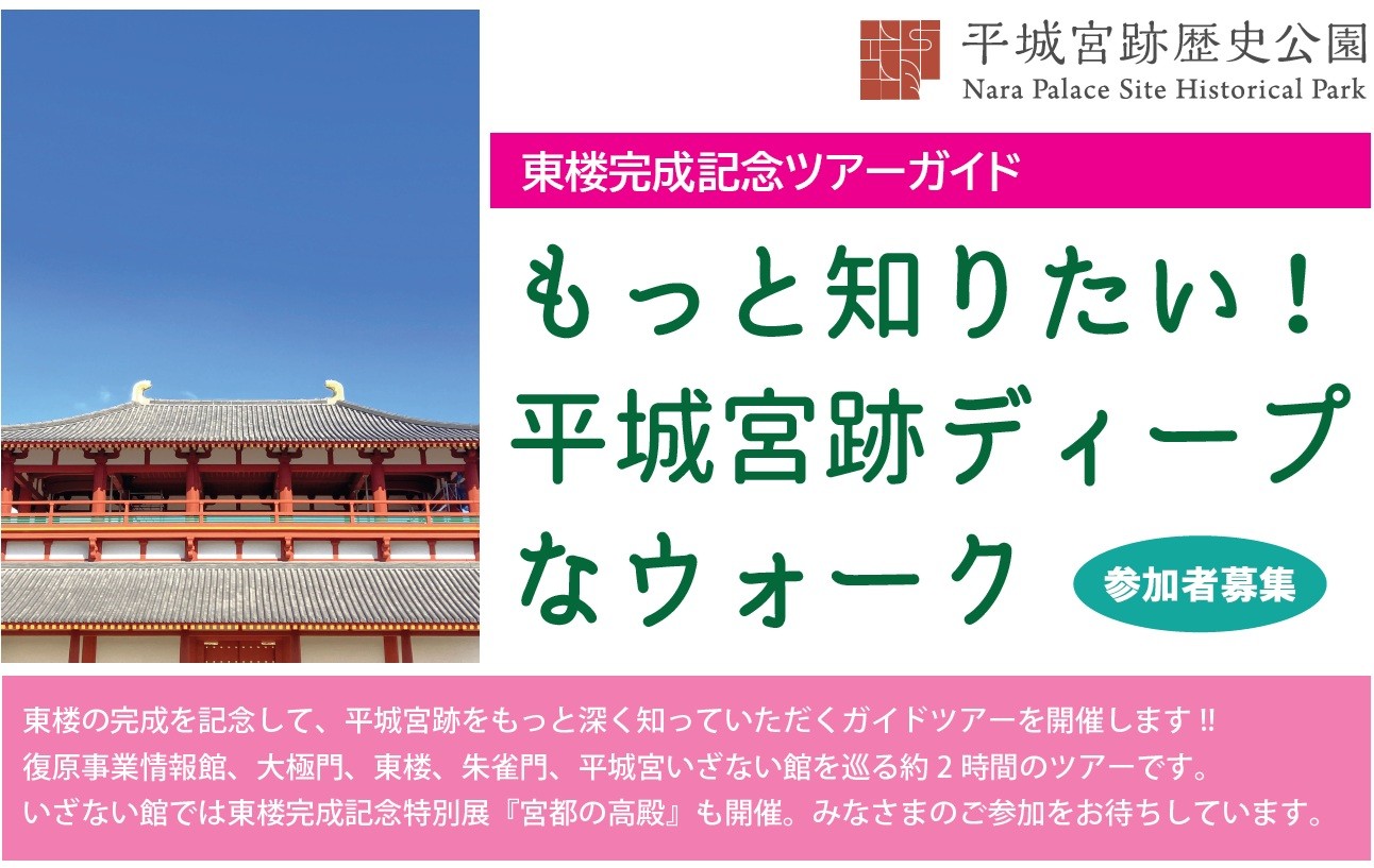 イベント情報 平城宮跡歴史公園は、奈良時代を今に感じる特別な空間です。 年間を通じて、平城京の歴史や体験学習、奈良らしい地域のイベントを毎月実施しています。 申込み制となっているものもありますので、イベント案内をよくご覧ください。 月別イベント一覧 2026年6月のイベント 2026年5月のイベント 2026年4月のイベント 2026年3月のイベント 2026年2月のイベント 2026年1月のイベント バックナンバー 2025年のイベント 2024年のイベント 2023年のイベント 2022年のイベント 2021年のイベント 2020年のイベント 2019年のイベント 2018年のイベント イベントで絞り込む スポーツトークイベント・講演会アート・クラフト歴史南門復原関連自然地域文化その他展示季節イベント 2026/03/15(日)平城宮跡いきものレンジャー「ツバメの巣の壁掛けオブジェづくり」 毎月テーマを変えて実施している平城宮跡いきものレンジャー。3月は『ツバメの巣の壁掛けオブジェづくり』をテーマに活動します。 自然関連イベント 2026/03/15(日)【東楼完成記念ツアーガイド】平城宮跡ディープなウォーク 東楼の完成を記念して、平城宮跡をもっと深く知っていただくガイドツアーを開催します!! 復原事業情報館、大極門、東楼、朱雀門、平城宮いざない館を巡る約2 時間のツアーです。 いざない館では東楼完成記念特別展『宮都の高殿』も開催。みなさまのご参加をお待ちしています。 歴史関連イベント 2026/03/14(土)平城京歴史講座「難波宮跡内裏地区の発掘成果と公園整備」 毎月開催している平城京歴史講座。 3月のテーマは、「難波宮跡内裏地区の発掘成果と公園整備」 歴史関連イベント 2026/03/14(土)東楼完成記念特別展「宮都の高殿」(会期:3/14~5/17) 第一次大極殿院 東楼(ひがしろう)の完成を記念して、特別展を開催します。東楼は大極門の東の位置に建つ2階建ての楼閣で、大極殿を囲う大極殿院の正面に荘厳さを加えていました。この展示では東楼だけでなく、奈良時代の宮跡の中心設備として大極殿院や内裏に併設されていた他の高殿をまじえて、その構造と機能をご紹介します。 展示関連イベント 2026/03/07(土)第12回写真撮影講座 初心者だけど、撮影技術を向上させたい方のための講座です。カメラの設定や構図の決め方などプロが教えないプロの技術も学べます。SNSに素敵な写真を投稿したい、 フォトコンテストにチャレンジしたい・・といった方にお勧めです。 アート・クラフト関連イベント 2026/03/05(木)カラダとココロを整えるヨーガ カラダとココロを整えるヨーガをはじめませんか?まずは外側のカラダから。季節ごとにがんばる臓器を整えるコツと、カラダの基礎を作る「食」について、クラスの初めにお話をします。 その後、ゆっくりとした呼吸にあわせて伸びやかにカラダを動かして筋肉をほぐすと、最後にはココロもほっこり整ってきます。 ヨーガを習慣にして、健康で自由なご自身を目指しましょう! その他関連イベント 2026/03/01(日)週末体験プログラム(3月) 平城宮いざない館では、日曜祝日等に様々な体験プログラムをお楽しみいただくことができます。 歴史関連イベント 1234