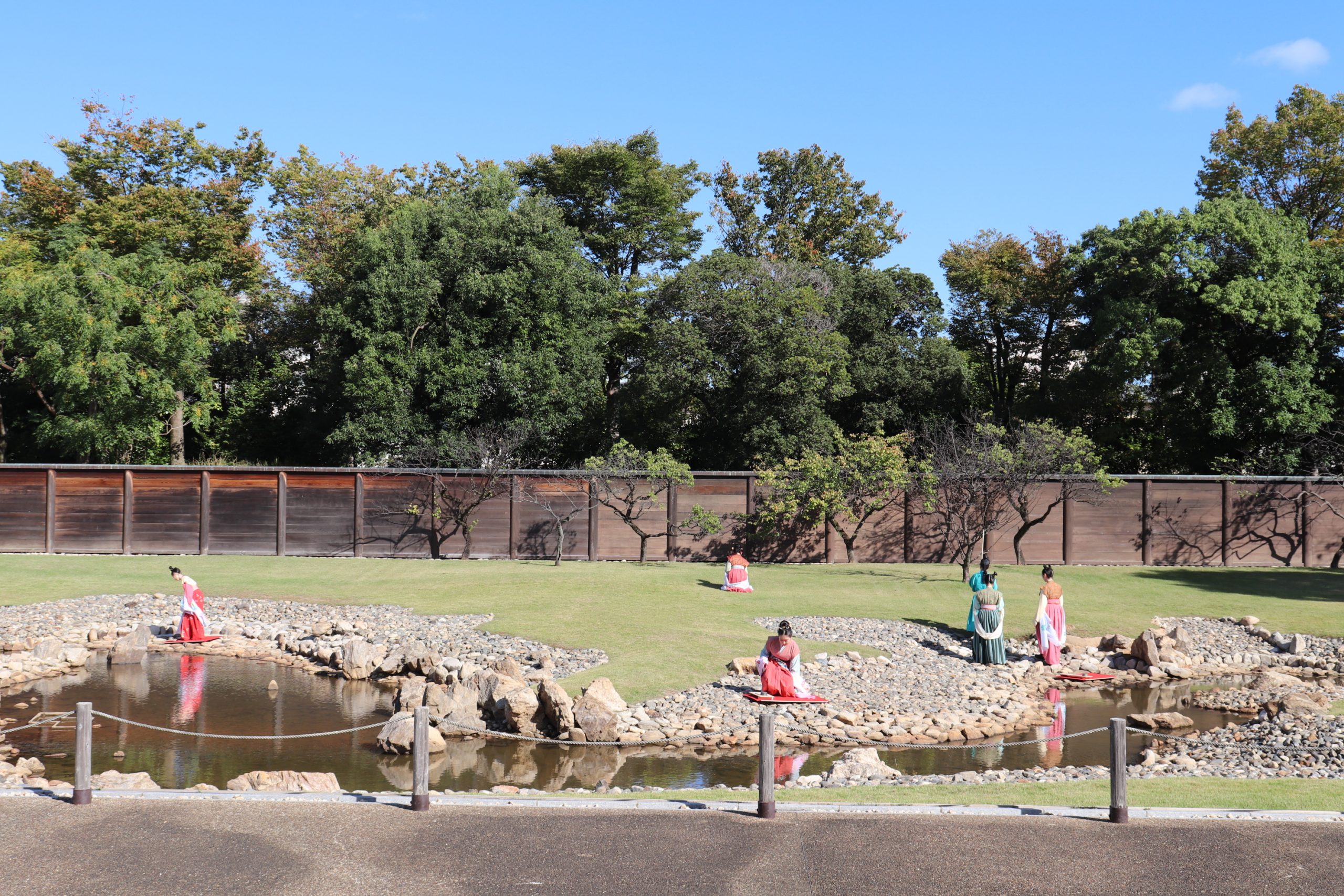 宮跡庭園では、舞や古代の儀式「曲水の宴」を再現します。