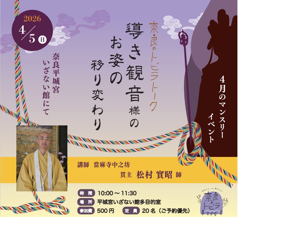 イベント情報|歴史 平城宮跡歴史公園は、奈良時代を今に感じる特別な空間です。 年間を通じて、平城京の歴史や体験学習、奈良らしい地域のイベントを毎月実施しています。 申込み制となっているものもありますので、イベント案内をよくご覧ください。 月別イベント一覧 2026年6月のイベント 2026年5月のイベント 2026年4月のイベント 2026年3月のイベント 2026年2月のイベント 2026年1月のイベント バックナンバー 2025年のイベント 2024年のイベント 2023年のイベント 2022年のイベント 2021年のイベント 2020年のイベント 2019年のイベント 2018年のイベント イベントで絞り込む スポーツトークイベント・講演会アート・クラフト歴史南門復原関連自然地域文化その他展示季節イベント すべてを表示する 2026/04/11(土)平城京歴史講座「菖蒲池(しょうぶいけ)古墳の歩んだ道」 毎月開催している平城京歴史講座。 4月のテーマは、「菖蒲池(しょうぶいけ)古墳の歩んだ道」 歴史関連イベント 2026/04/05(日)奈良のトビラ マンスリーイベント「導き観音様のお姿の移り変わり」 當麻寺中之坊さんのご本尊「導き観音様」は、平安時代に造られたとされる優美な観音さまで、人々の信仰を集めてきました。長い年月のあいだに幾度も修復が行われ、姿を受け継ぎながら今日に伝えられています。 仏像や庭園など、寺院には多くの文化財があり、それらは人の手によって守られ続けてきました。 今回は導き観音様のお話を入口に、寺院の立場から文化財の修理や保存の裏側についてお話を伺います。 地域文化関連イベント 2026/04/05(日)週末体験プログラム(4月) 平城宮いざない館では、日曜祝日等に様々な体験プログラムをお楽しみいただくことができます。 歴史関連イベント 2026/03/22(日)【古都奈良の歴史体験型演劇イベント】平城遷都誘宵記(へいじょうせんといざよいき)3/22※定員に達し受付終了いたしました。 衣装に着替えて参加する歴史演劇イベント 711年、完成間近の平城京に「白い影」が現れた 「… ...まつれ… …なぜ忘れた… ...」 このミステリーを解決するのは、奈良時代に タイムスリップした「あなた」 物語に登場するのは、「元明天皇」「藤原不比等」「太安万侶」 そして、あなたは幽霊を探し出し、都を救うという使命に挑む。 なぜ幽霊は現れるのか、その謎を解いてください! その他関連イベント 2026/03/22(日)平城のとよほき 平城のとよほきを開催します! ケータリングやお弁当などの飲食、奈良県や奈良時代に関するグッズ制作をしている作家の作品販売やワークショップの「祥瑞マルシェ」 官位の色の服などを着用した方にプレゼント(数量限定)を差し上げる「#moppoi#joyppoi」など多くのイベントを開催します。 地域文化関連イベント 2026/03/22(日)【平城のとよほき】正倉院文様皿(密陀絵皮箱)の絵付け体験 食器として使える美しいお皿の絵付けをしませんか。下絵の文様を素焼きのお皿に描き写し陶芸用顔料で絵付けをした後、一旦お預かりして釉薬を掛けて焼き上げます。(送料は別途要) 歴史関連イベント 2026/03/22(日)【平城のとよほき】刀子づくり 奈良時代から使われてきた道具「刀子」を題材に、ものづくりを体験します。 歴史関連イベント 2026/03/22(日)【平城のとよほき】キハダの染色体験 奈良の薬樹・キハダの煮出し液で布を一枚染色します。染めた布はお持ち帰りいただき、ご自宅で乾燥させて完成となります。 歴史関連イベント 2026/03/22(日)【平城のとよほき】東楼の宴 大極殿院の復原東楼が、ついにその姿を現しました。奈良時代、大極殿院の東西に建つ楼閣では、朝廷の儀礼に伴う宴などが行われていたと考えられています。企画展「宮都の高殿」にあわせ、東楼で行われていたとされる行事について解説を行いながら、当時の宴の準備の雰囲気を想像し、楽しめる演出を行います。 歴史関連イベント 2026/03/22(日)【平城のとよほき】「祥瑞(しょうずい)マルシェ」 ケータリングカー&ブースでお弁当やスイーツ、テイクアウトできるフードなどなど、おいしいものいっぱい! また奈良県や奈良時代に関する奈良愛あふれる雑貨や作品もたくさんやってきます! ぜひぶらりとのぞいて見てくださいね! 季節イベント関連イベント 12345...102030...