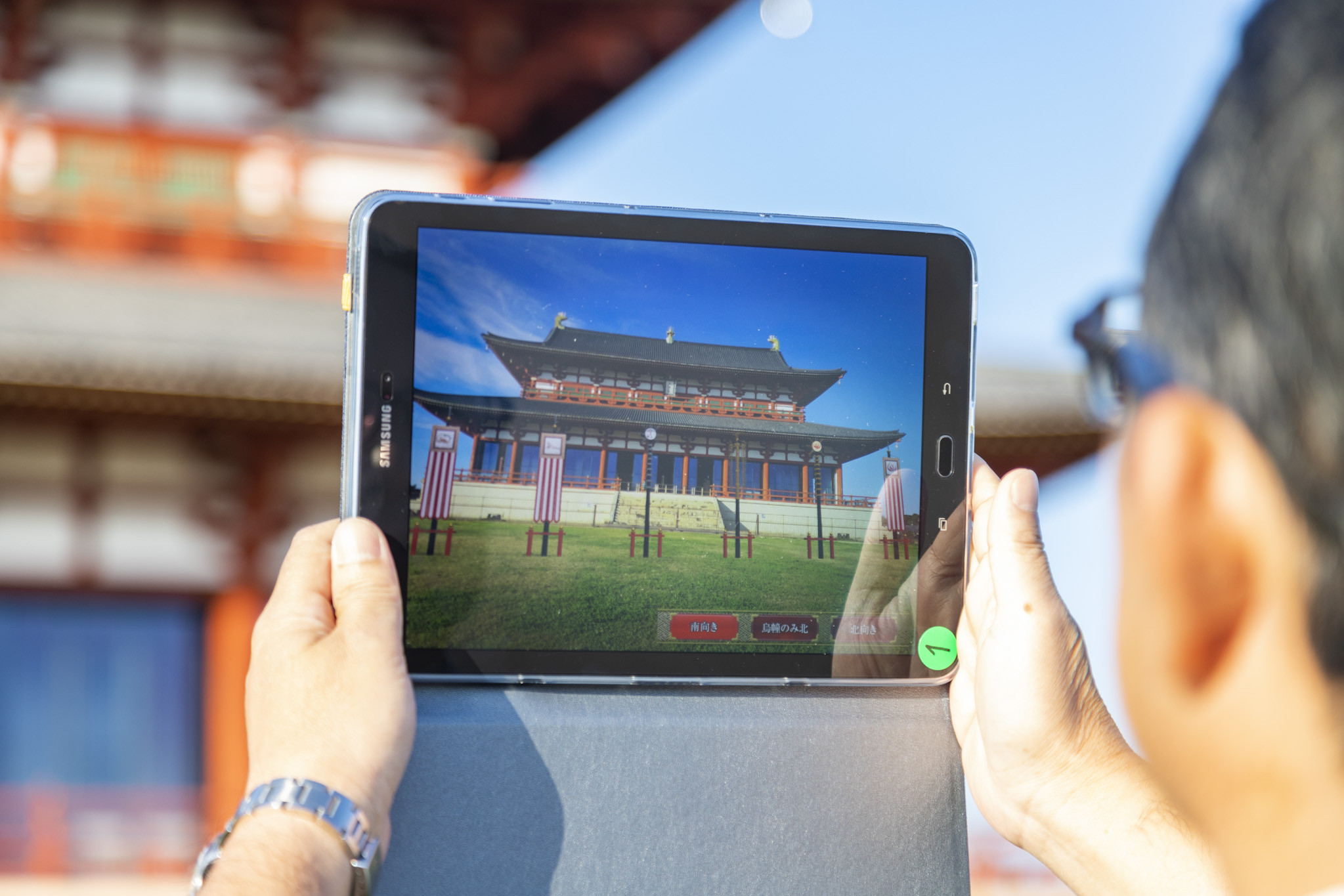 第一次大極殿院の発掘調査で確認された儀式用の旗の復元CGを画面上で立ち上げる、ARアプリ「AR宝幢・四神旗」の体験会を開催します。